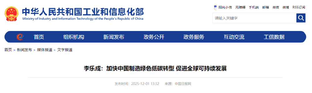 2025年12月1日,《中国日报》刊发工业和信息化部党组书记、部长李乐成署名文章,题为《加快中国制造绿色低碳转型促进全球可持续发展》。文章指出,加强绿色产业国际合作。中国制造将秉持共商共建原则,利用好双边和多边国际合作机制,深化绿色技术、绿色装备、绿色贸易、绿色标准等方面交流合作。鼓励中国光伏、风电、锂电池、新能源汽车等优势企业“走出去”,在“一带一路”等国家投资建设绿色能源项目,推广绿色基础设施和交通解决方案。积极参与绿色低碳国际规则制定,加强国际公约履约能力建设。